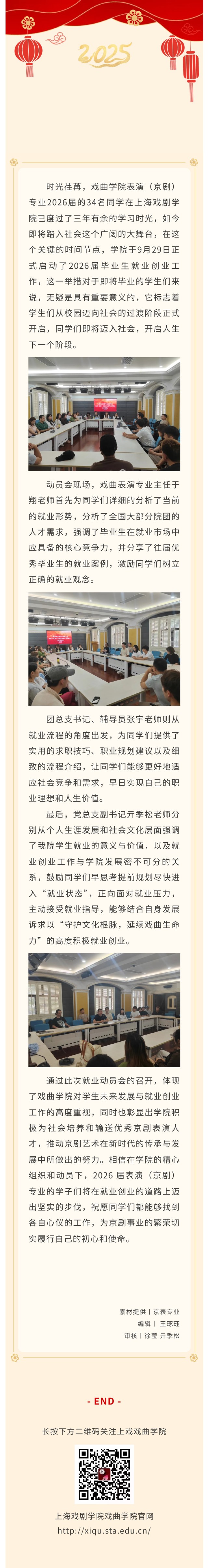 上戏戏曲学院举办2026届表演(京剧)专业毕业生就业动员会